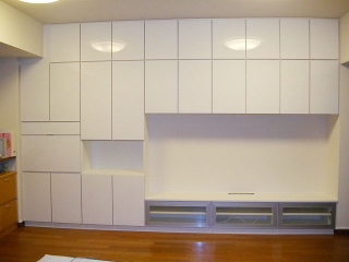 工事が終わってビックリ!何がビックリかってその収まりの素晴らしさにです。ちょうど収めたかったスペースに理想的に壁面収納が設置されてちょっぴり感動しています。笑 テレビやプリンターなども収まりよく部屋がスッキリとしました。面材も光沢のある鏡面ホワイトを選びました。とっても清潔感のある雰囲気になり、部屋全体も明るい空間になりました。今まで押入れに詰め込んでいた大事なものも、少しづつ取り出して壁面収納の方に移すようにしています。そしてもう一ついい光景が。それは何かって言うと・・『家族みんながリビングにいる時間が増えました!』笑 こういった所にも影響を与えてくれるなんて、リフォームって不思議ですよね。またやりたい箇所が見つかりましたら、真っ先にご相談させていただきます!その時は宜しくお願いします!!
