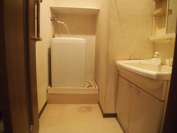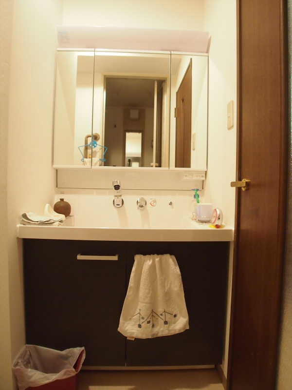 「洗面化粧台っていくらで工事できますか」というご質問からご訪問させていただくことに。奥様のご要望としてはまずは『全収納の三面鏡』でした。鏡の裏にたくさん収納できる三面鏡はやはり人気ですよね。あとおっしゃっていたのが「右側に空間が空いてるでしょ?こっちにいつも水が跳ねるもので、どうしてもここのクロスが汚れちゃうのよね」とのこと。そこの空間を埋めるように小さなダンボールやゴミ箱が置かれている状態でした。スペースの幅を計測してみると・・『スペース900mmですね。特注寸法というわけでもないので、今出てる製品でピッタリと収めることができますよ」とご提案をさせていただいたところ、すごく喜んでいただいたのを覚えています。せっかく化粧台を取り外すので、あわせて洗面所の内装(クロス張替え・クッションフロア張替え)もあわせて工事をさせていただくことになりました。着工が楽しみです。