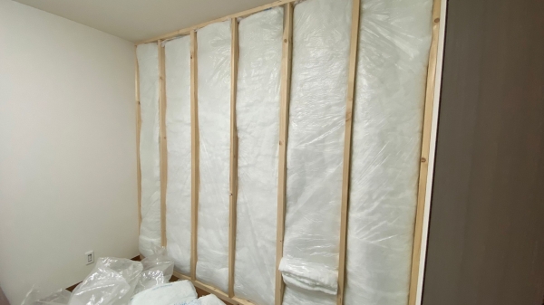 新築の際に、子供部屋にドアを2つ設けて将来真ん中に壁を作れば二部屋にできるようにしてあるお宅です。お子さん達が大きくなってきたので個室にしてあげたいということで、部屋の真ん中に間仕切り壁を作ってほしいというご依頼でした。