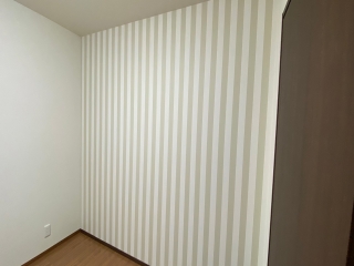 今回は壁の一面はシンプルな白、もう一面は薄いグリーンの大きなストライプでアクセントをつけました。