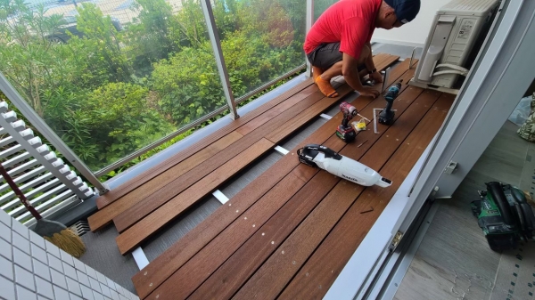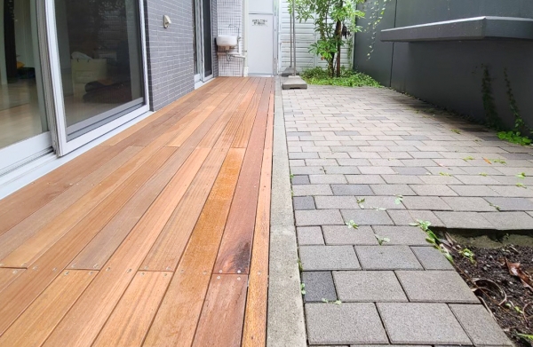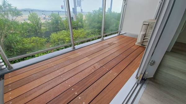 日々お仕事が忙しい体と心を癒すため、リゾートマンションのようなくつろげるお部屋作りをされていました。その中でマンションのベランダの床が塩ビシートであることが気になっていたそうです。そこで、ウッドデッキに使用する雨に強い木材であるウリン材を使用して、ウッドデッキを造作することをご提案しました。